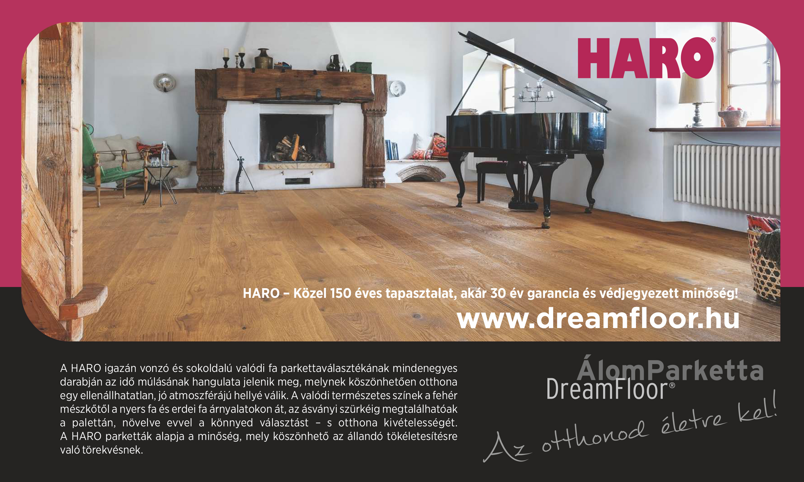 A népszerű Otthon magazin októberi számában bemutatásra került a HARO szalagparketta kollekciója: „Változást hozunk az életébe a HARO valódi fa parkettáival, melyek az idő múlásáról mesélnek…” A HARO igazán vonzó és sokoldalú valódi fa parkettaválasztékának mindenegyes darabján az idő múlásának hangulata jelenik meg, melynek köszönhetően otthona egy ellenállhatatlan, jó atmoszférájú hellyé válik. A valódi természetes színek a fehér mészkőtől a nyers fa és erdei fa árnyalatokon át, az ásványi szürkéig megtalálhatóak a palettán, növelve evvel a könnyed választást – s otthona kivételességét. A HARO parketták alapja a minőség, mely köszönhető az állandó tökéletesítésre való törekvésnek. HARO – Közel 150 éves tapasztalat, akár 30 év garancia és védjegyezett minőség!